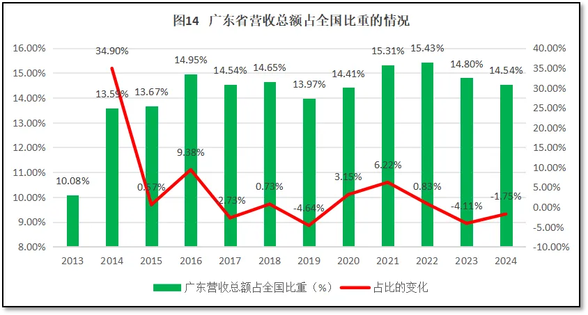 广东省作为检验检测大省,其检验检测机构营收总额在全国检验检测行业中排名第一。2024年度,广东省检验检测机构营收总额达到708.97亿元,占全国检验检测行业年度营业收入的14.54%。过去12年广东省检验检测行业年度营业收入总额在全行业中的占比情况如图14所示。