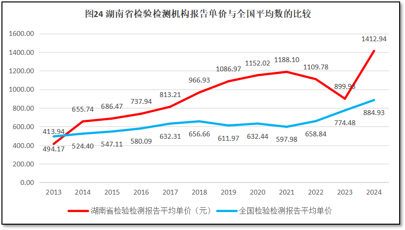 由图24可见,在2021年之前,湖南省检验检测报告的单价持续增长,到2021年达到1188.1元的峰值,但此后逐步下降,到2023年降到899.93元。不过2024年由于报告数量大幅度下降,使得湖南省检验检测机构的报告单价出现较大反弹,达到了1412.94元的历史最高水平。从变化曲线来看,除了2013年,其余年份湖南省检验检测报告单价都高于全国平均数,从这个角度来说,湖南省低价竞争现象相对较少,只要确保适当的业务量,检验检测机构应当可以获得较好的利润回报。