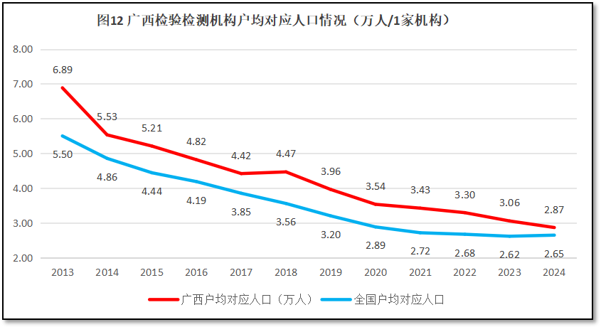 由图12可见,过去12年,广西壮族自治区检验检测机构户均对应的人口数量变化规律与全国的情况相似,都是逐年下降的趋势,但具体数值上广西壮族自治区都比全国平均数要高。广西壮族自治区检验检测机构从2013年的户均对应6.89万人,下降到2024年的2.87万人左右,与全国的曲线逐步靠近。从人口数量的对比值来看,广西壮族自治区检验检测机构数量相对不足,但从户均对应GDP值看,又显得多了。这说明广西壮族自治区尽管经济保持增长,但毕竟经济总量还不大,且当地农业人口众多,因此才会出现这种相互矛盾的现象。